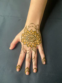 Henna and Jagua are completely natural plants that when applied to skin, bond with our proteins to create a temporary tattoo. Henna stains the skin reddish brown and lasts up to 3 weeks. Jagua stains the skin navy blue and lasts up to a month.